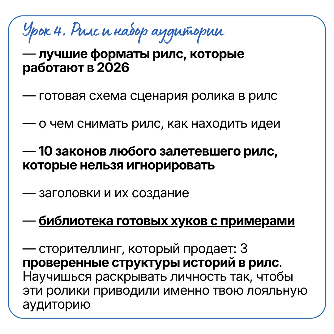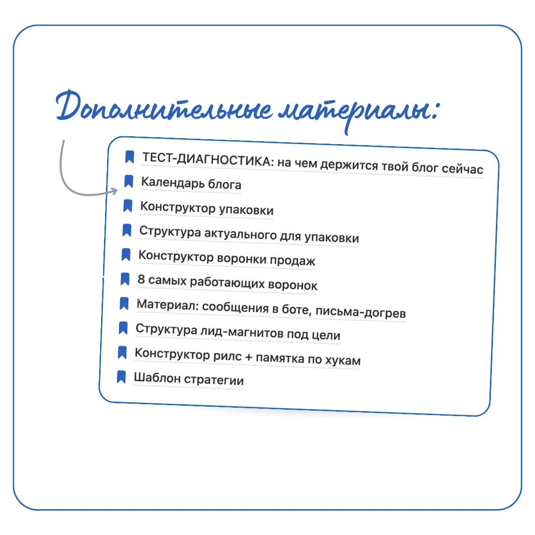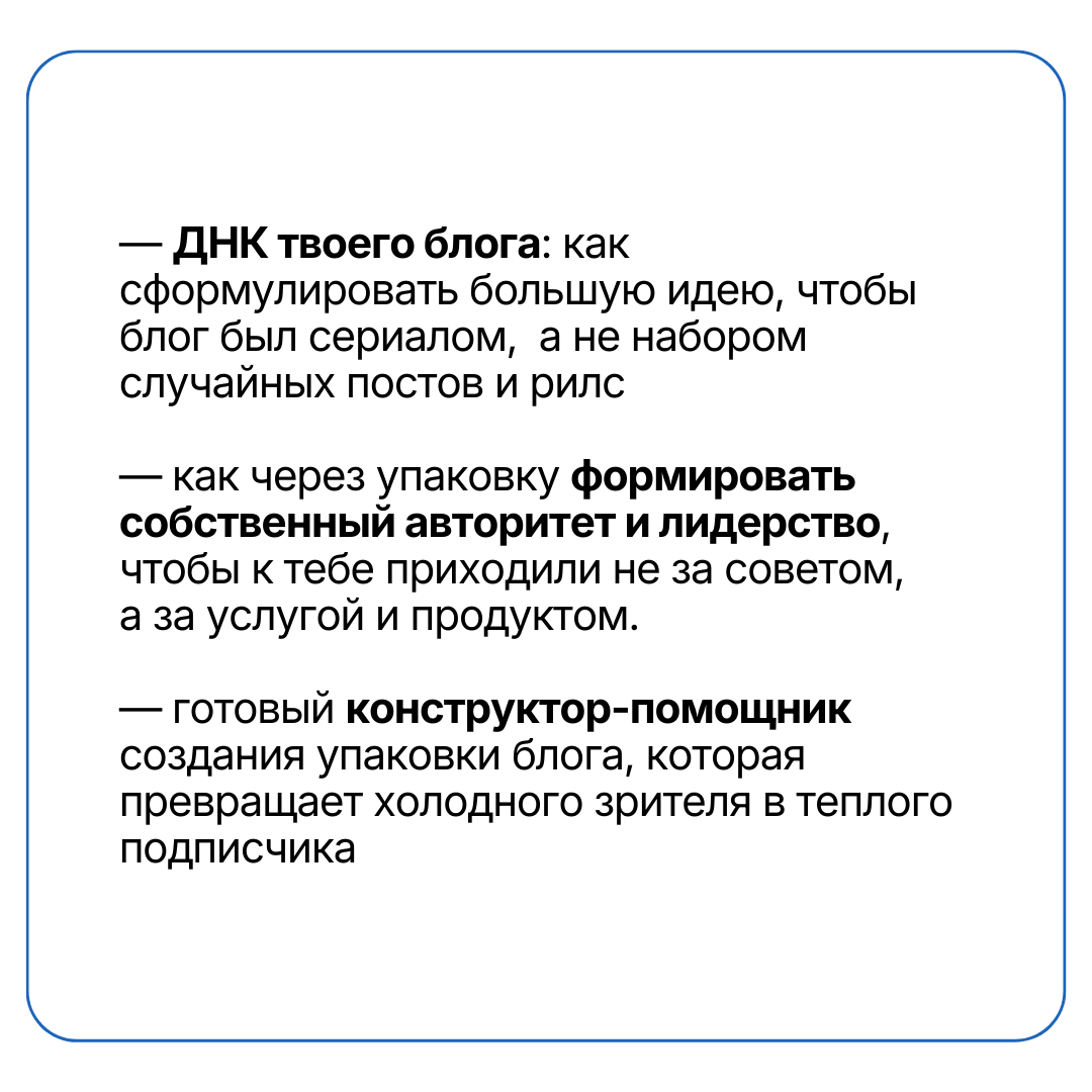 Я соединяю стратегию и внутреннюю опору. Почему это важно? - Блог без состояния — это выгорание. - Состояние без стратегии — это хаотичный постинг. Я собрала пошаговый план, в котором рассказала, как именно: 1. Найти ваш главный смысл, который отражает вашу супер-силу 2. Превратить этот смысл в управляемую воронку, которая работает на вас. 3. Создавать рилс, которые растят ваш блог, а не набирают 300-500 просмотров Это ваш план, чтобы создать не просто блог, а финансовый АКТИВ, который будет работать долгие годы.
